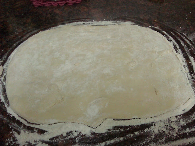 Prepare a work surface by spreading some flour on it. Now take out the flour on the work surface. Sprinkle with flour. Pat it to spread into a rectangular shape. There should be enough flour to spread the dough into rectangular shape. Patting with remove the excess. Let it sit for 5 minutes.